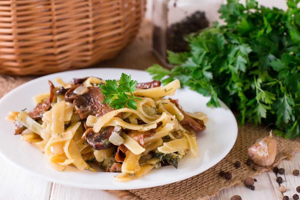 Для блюда подойдут свежие, замороженные или высушенные лесные грибы. Для свежих потребуется 150 г, для замороженных — 100 г, а сушёных достаточно 25 г.