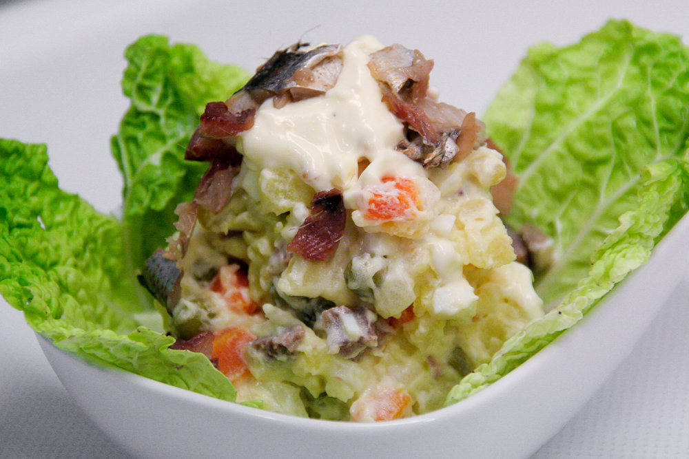 Последовательность такова: отложите нужную порцию смеси в миску, полейте соусом и поставьте в морозильник на 10 минут. Затем сформируйте пирамидки, сбрызните оставшимся соусом, выложите сверху кильку и подавайте: