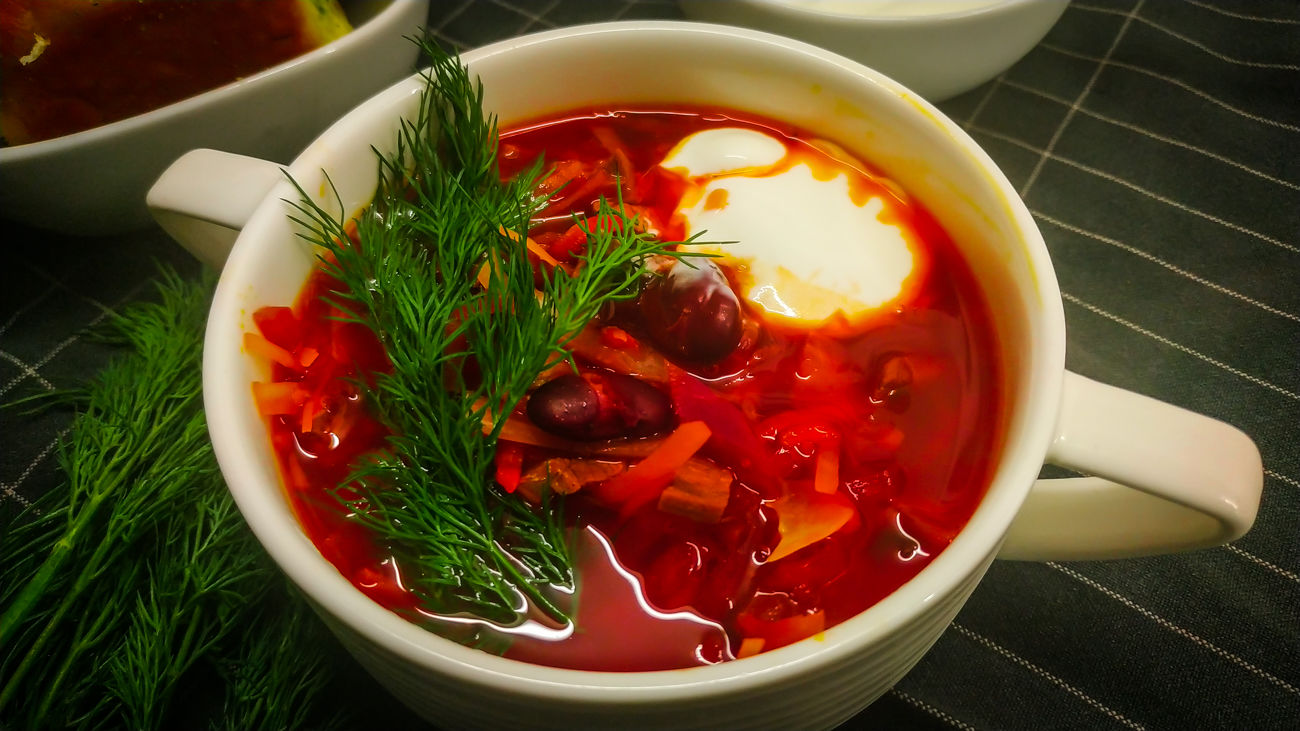 Даём борщу настояться 15 минут. Подаём со сметаной и свежим укропом.