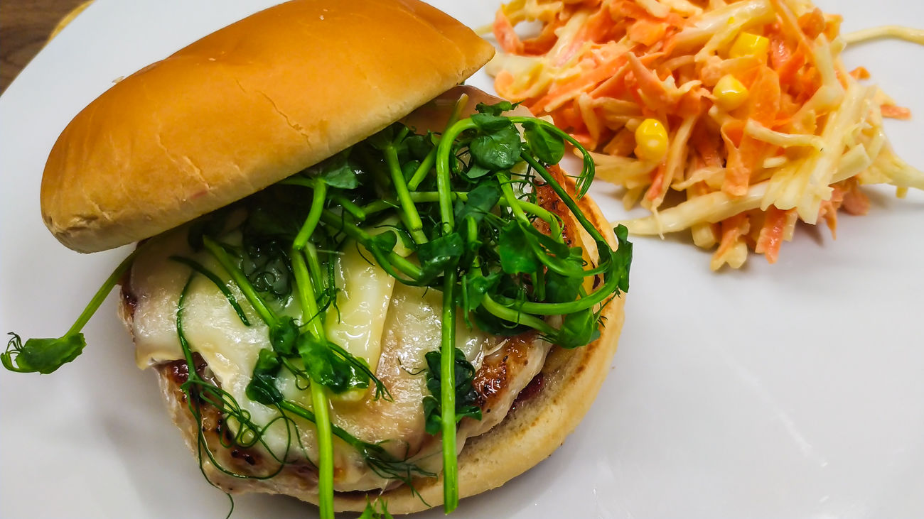 Нижние булочные половинки покрываем брусничным соусом. Выкладываем обжаренные яблочные слайсы, котлеты с расплавленным сыром и свежую микрозелень.