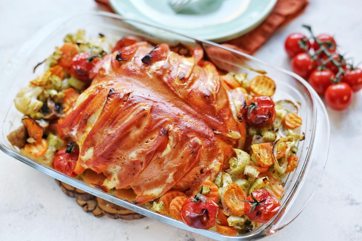 Разместите овощи рядом с курицей на противне. Отправьте в духовку, предварительно разогретую до 180°C. Выпекайте 45 минут.