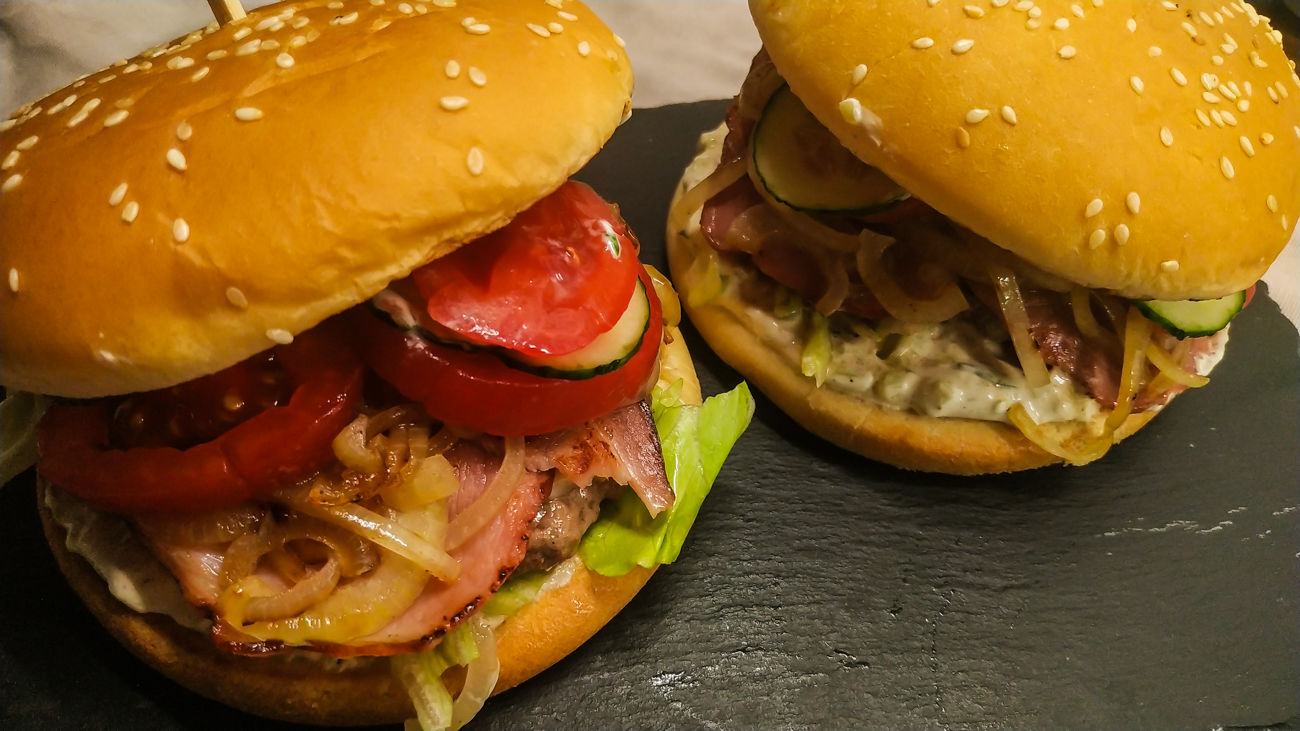 Намазываем булочки соусом. На нижнюю часть выкладываем салат айсберг, затем котлету, бекон, лук, огуречные и томатные кружочки…