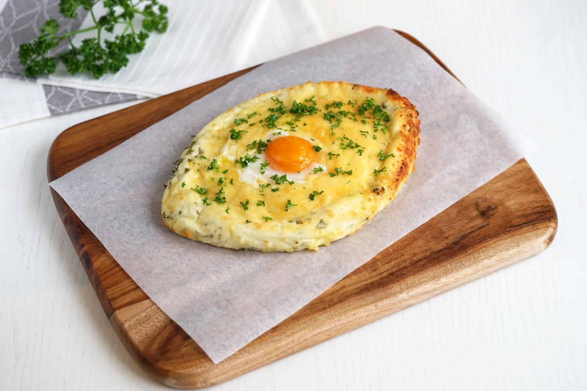 Подавайте блюдо горячим. Желток сохранит текучую текстуру, а сыр под золотистой корочкой будет тянуться. Перемешайте начинку вилкой перед употреблением. Безглютеновые хачапури готовы! Приятного аппетита.