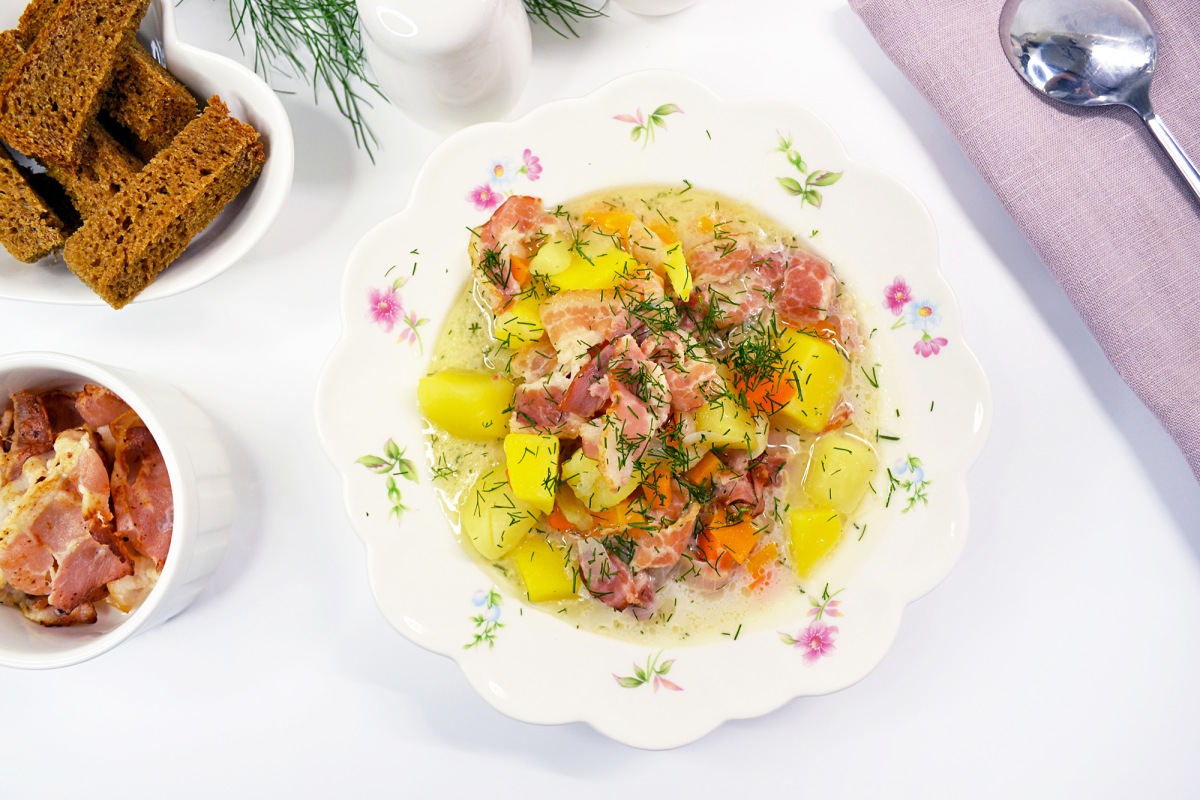 Подготовьте все компоненты: овощи, приправы, бекон и плавленый сыр. На этот раз я варю увеличенную порцию в объемной кастрюле – блюдо исчезает со стола моментально.