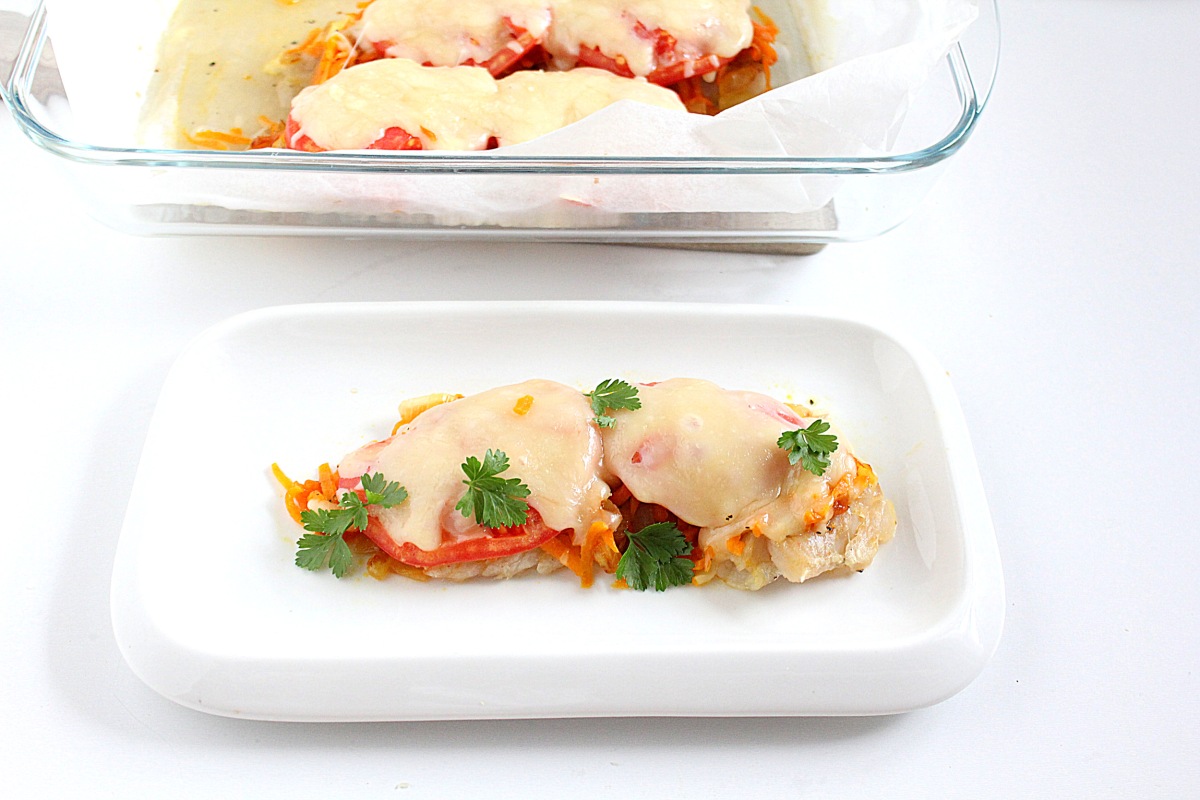 Достаньте форму с рыбой и равномерно распределите овощную зажарку. Количество овощей можно регулировать по вкусу – данной порции хватит и на большее количество филе.