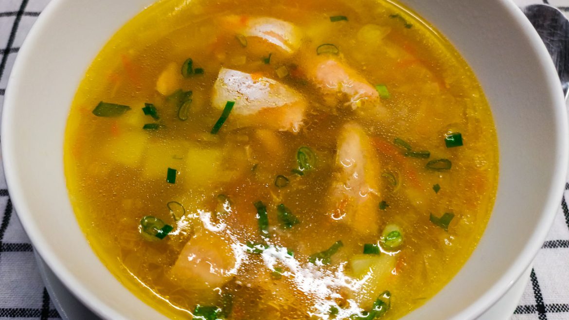 Доводим бульон до кипения, закладываем картофель с перловкой. Варим 15 минут, затем добавляем пассерованные овощи и готовим ещё четверть часа. В конце вводим рыбные куски, выключаем плиту и настаиваем под крышкой 10 минут.