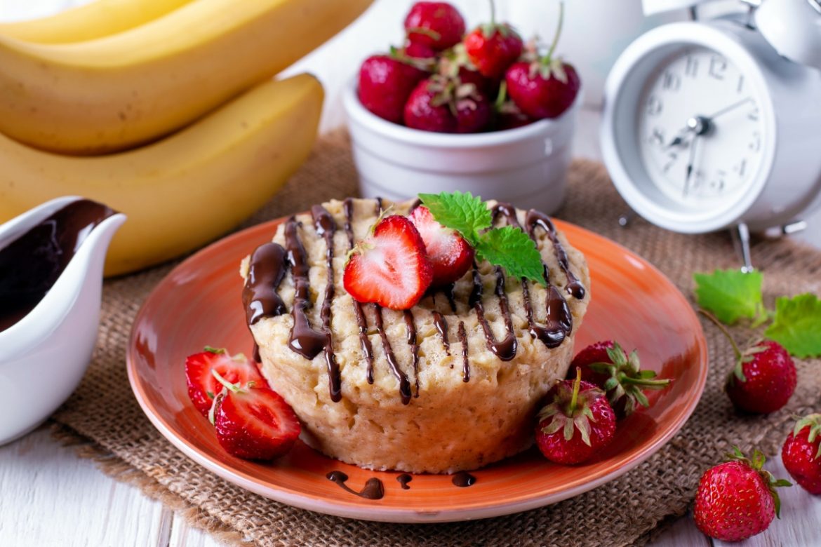 Осторожно извлеките выпечку из формы на тарелку. Украсьте по вкусу. В моем случае – растопленный шоколад и свежая клубника.