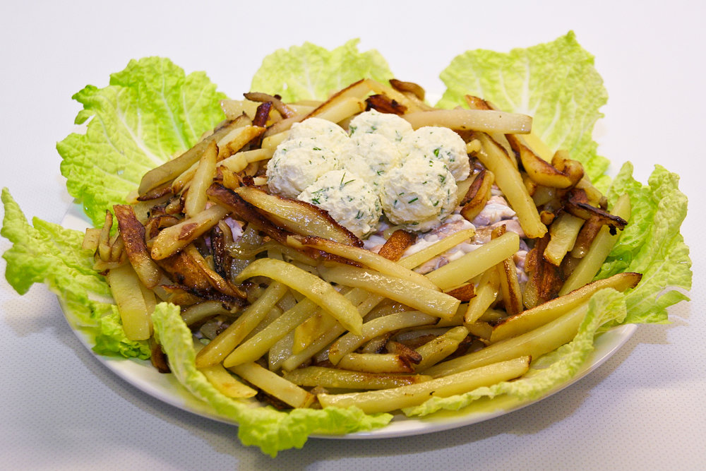 Оформляем блюдо: по краям размещаем салатные листья, а сверху выкладываем жареный картофель: