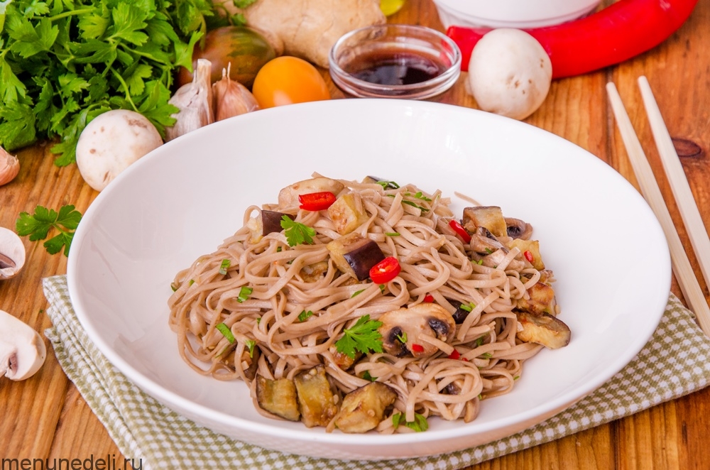 Соберите все продукты для блюда из лапши соба с баклажанами.