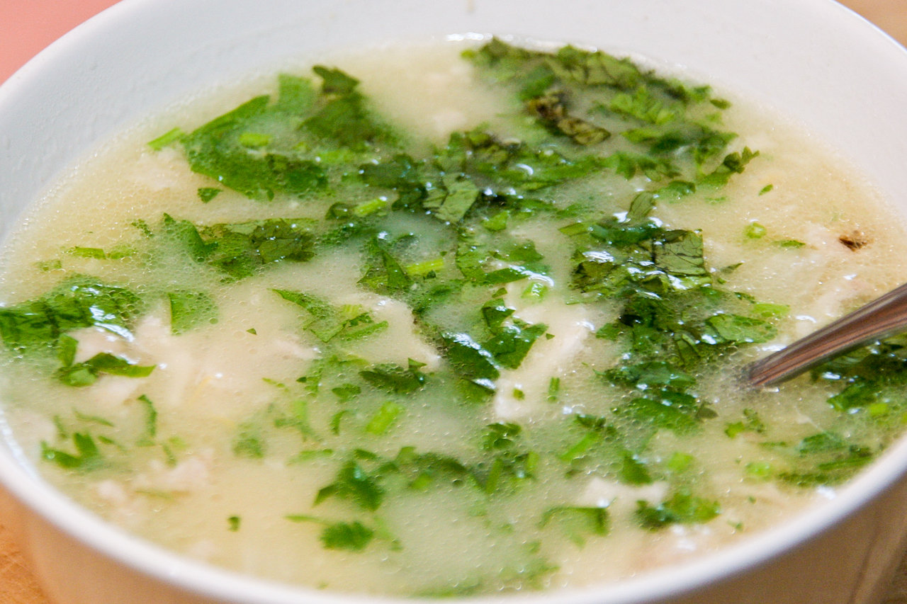 Интенсивно взбиваем их и тонкой струйкой вводим в тёплый (не горячий!) бульон, постоянно помешивая для равномерного распределения: