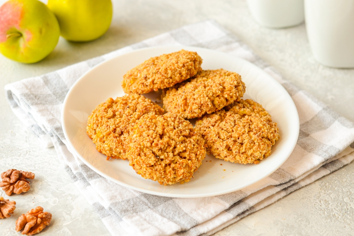 Отмерьте точное количество сахара, овсяных хлопьев и грецких орехов с помощью кухонных весов для экономии времени. Яблоко промойте под водой и высушите бумажной салфеткой.