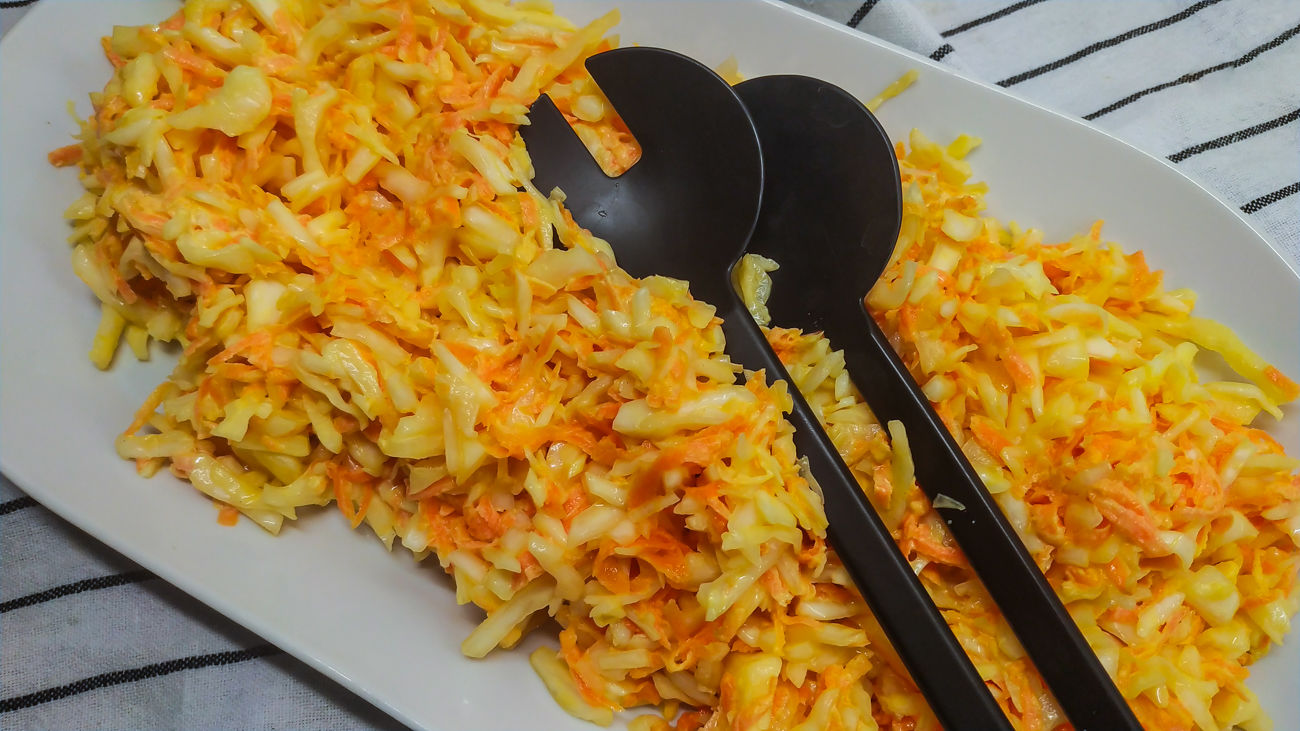 Капусту нашинкуем тонкой соломкой, морковь измельчим при помощи тёрки среднего размера.