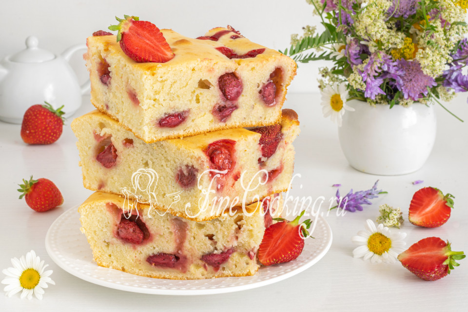 <divрогий клубничный пирог для семейного завтрака или чаепития. Основа приготовлена на кефире без добавления дрожжей, с использованием двух видов жи: сливочного и растительного. В результате получается аппетитная, умеренно сладкая и питательная выпечка с ягодной начинкой.