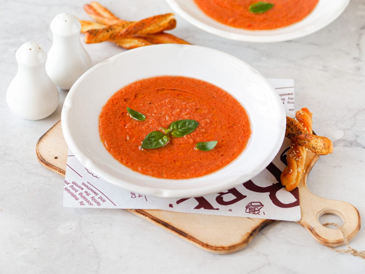 Обязательно удалите кожицу с помидоров, иначе она испортит текстуру супа.