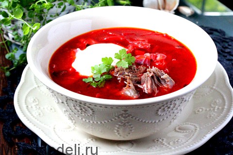 Подавайте ароматный борщ со сметаной! Мясо добавьте порционно в тарелки или нарежьте и прокипятите в супе за 5 минут до готовности. Приятного аппетита!