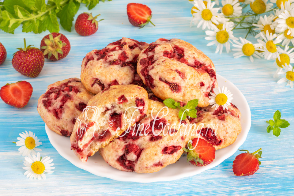 Потрясающе вкусное домашнее печенье с простой рецептурой. Нежная, пышная и слегка крошащаяся текстура основы прекрасно дополнена ароматными ломтиками спелой клубники. Обязательно попробуйте!