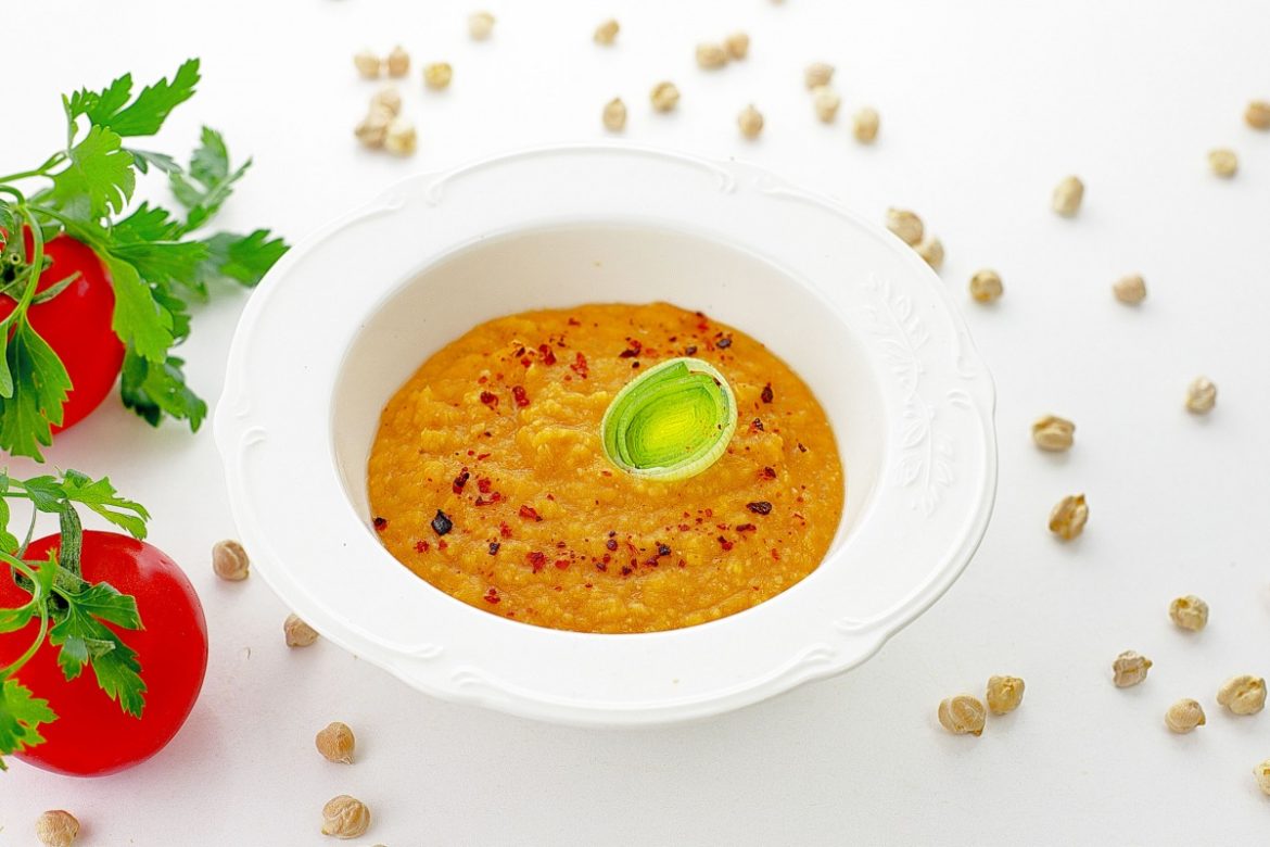 Соберите все компоненты для томатного нутового супа-пюре.