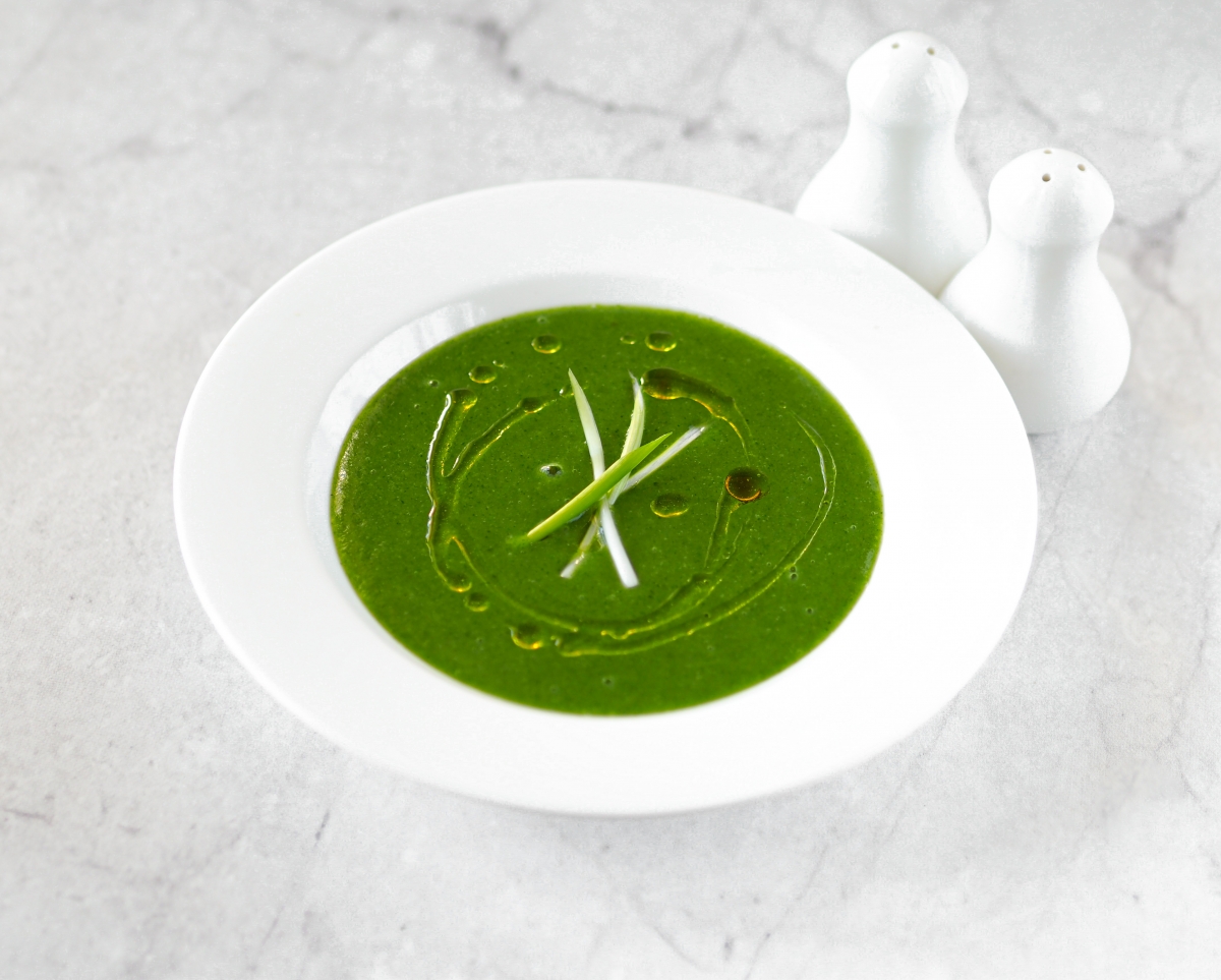 Измельчите содержимое погружным блендером до однородности. Без сливок суп сохранит интенсивный зелёный цвет и кремообразную структуру.