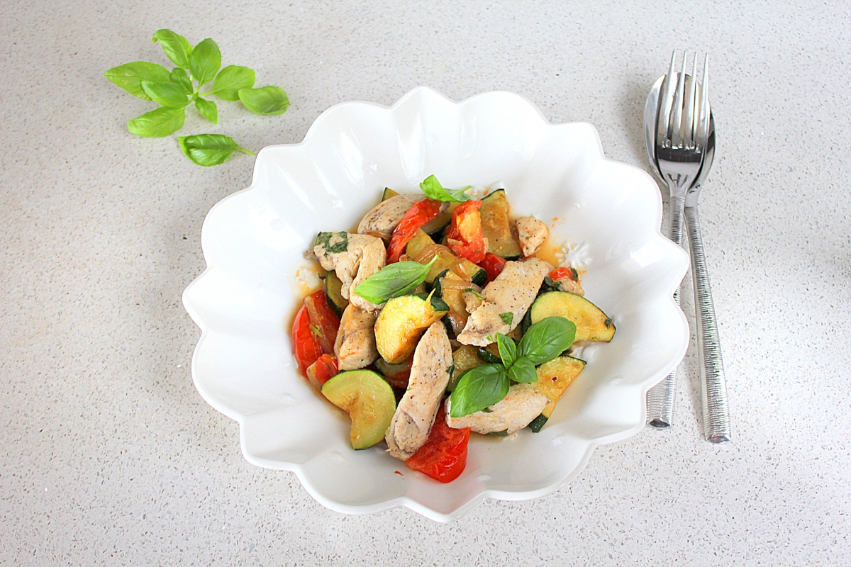 Верните курицу в сковороду к овощам, добавьте рубленый базилик. Аккуратно перемешайте, накройте крышкой и томите на тихом огне 5 минут.