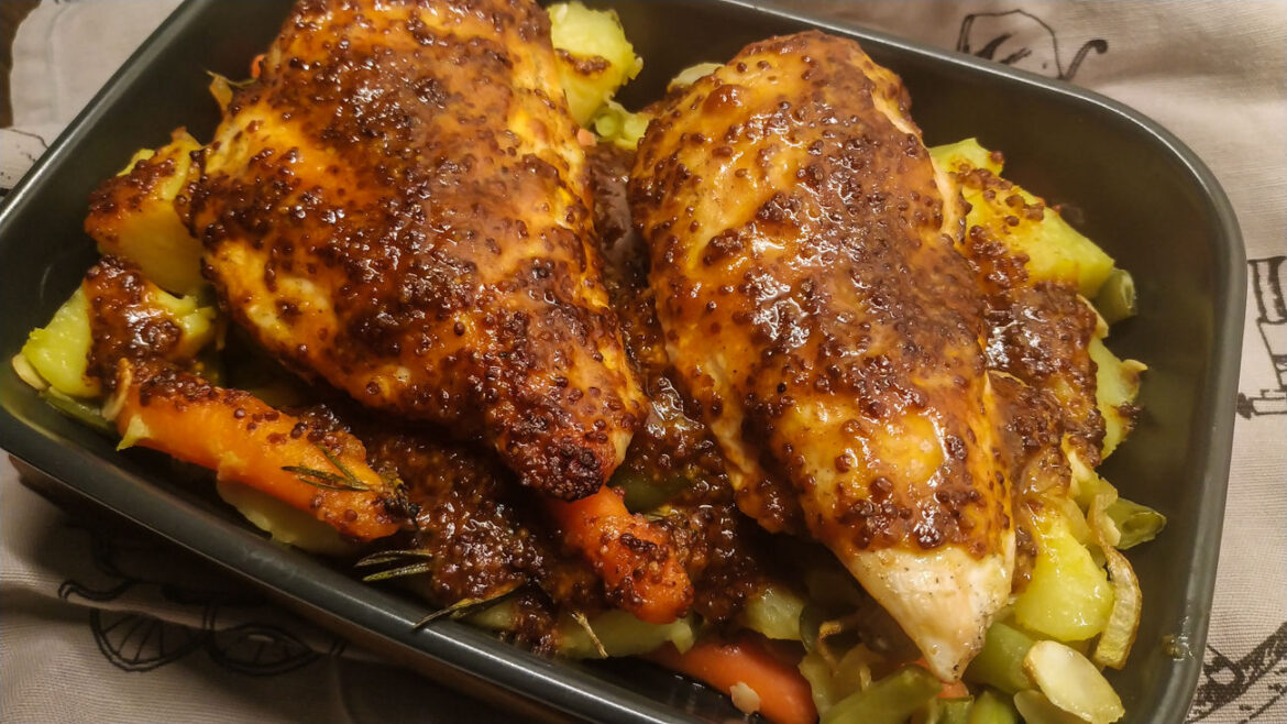В форму первым слоем выкладываем овощи, сверху распределяем курицу, покрываем медово-горчичной глазурью и запекаем при 180°C 15 минут.