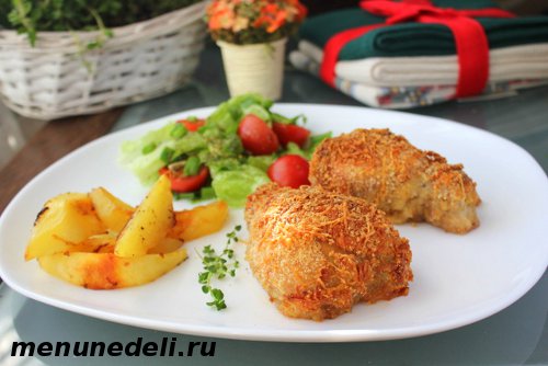 Приготовим панировку. Натрите сыр на мелкой терке, смешайте с панировочными сухарями и кукурузной крупой. Если крупы нет, увеличьте количество сухарей или используйте манку.Взбейте яйцо с молоком вилкой.Обваляйте ножку в муке, затем окуните в яичную смесь и обваляйте в сырно-сухарной панировке.
