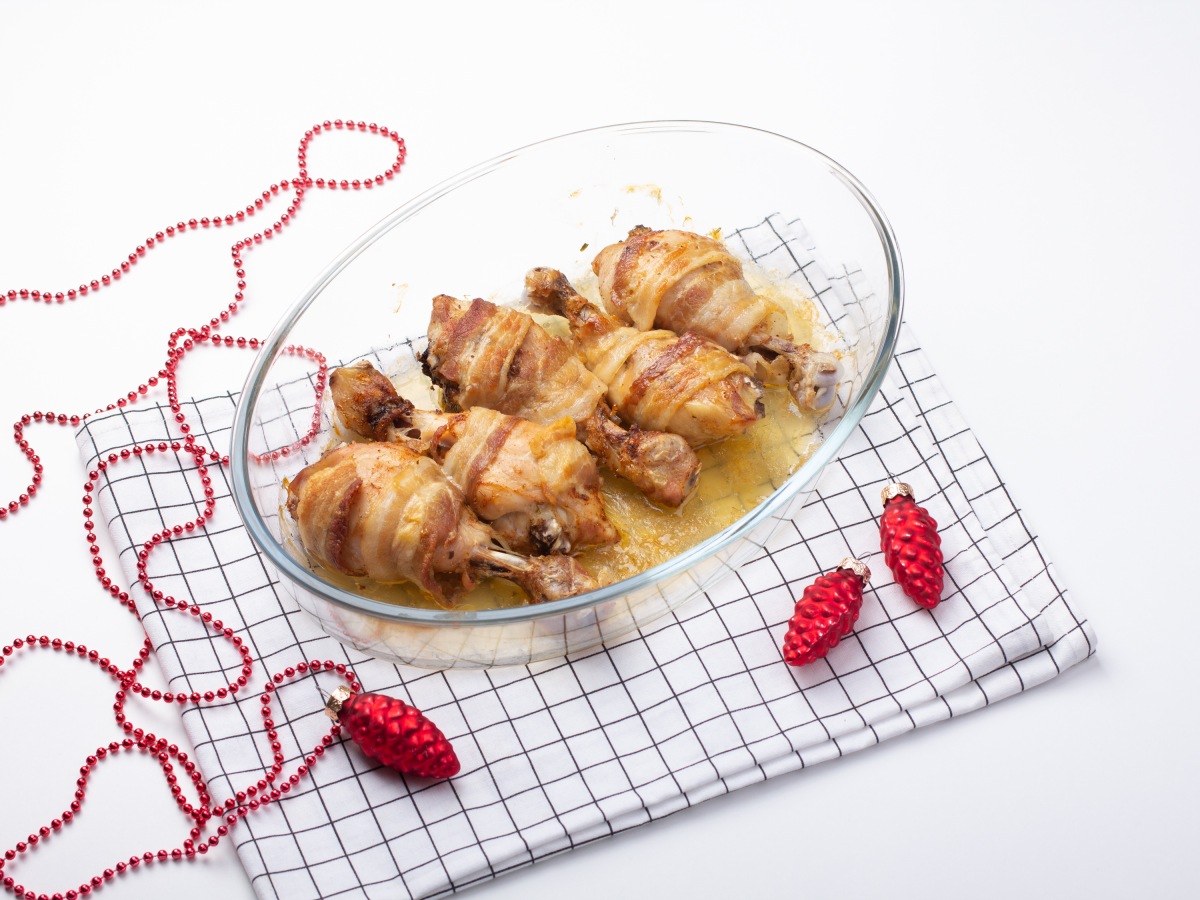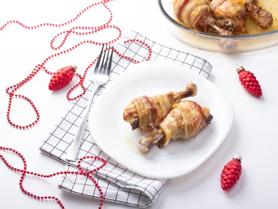 Аппетитные куриные ножки в беконе готовы к праздничной подаче.