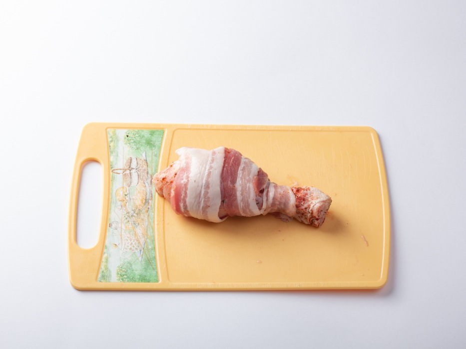 Оберните каждую голень ломтиком бекона.
