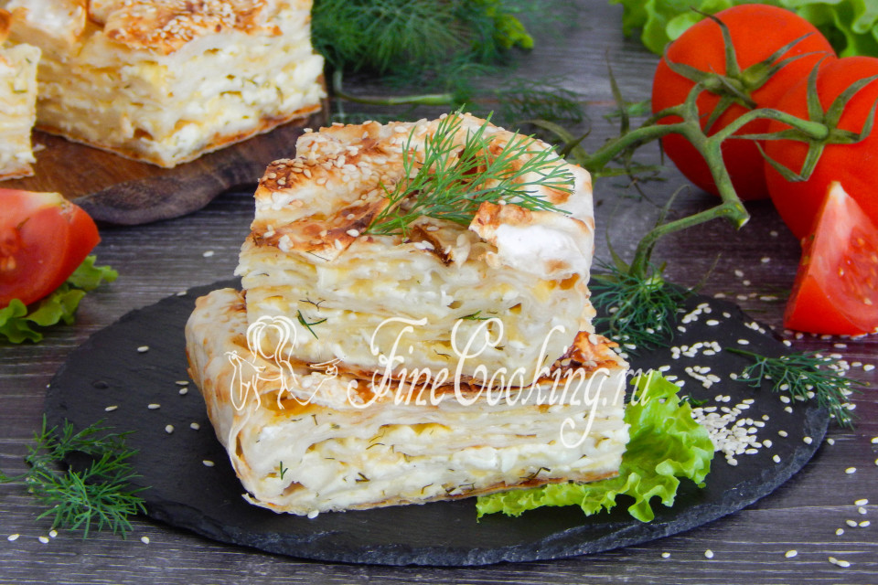Чередуйте слои: сыр — пропитанный лаваш, пока не используете все компоненты.