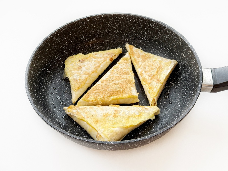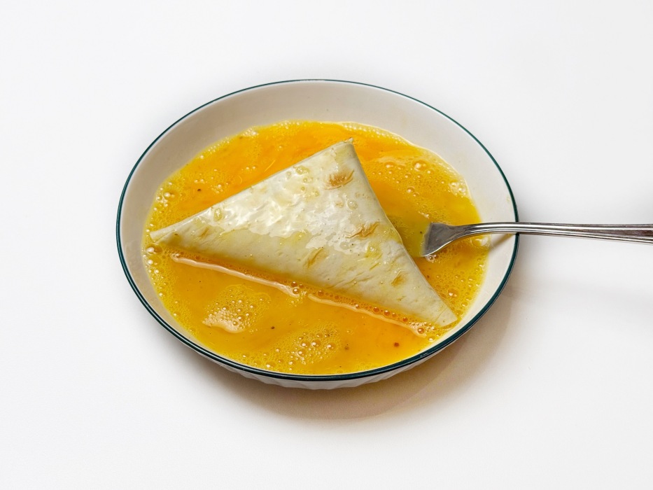 Окуните каждый треугольник в яичную смесь, тщательно покрывая швы.