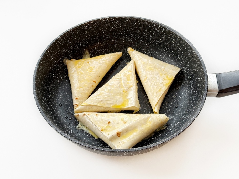Когда нижняя часть подрумянится, сразу переверните конвертики. Для равномерности обжарки переверните их ещё раз. Готовьте до золотистого цвета с двух сторон.