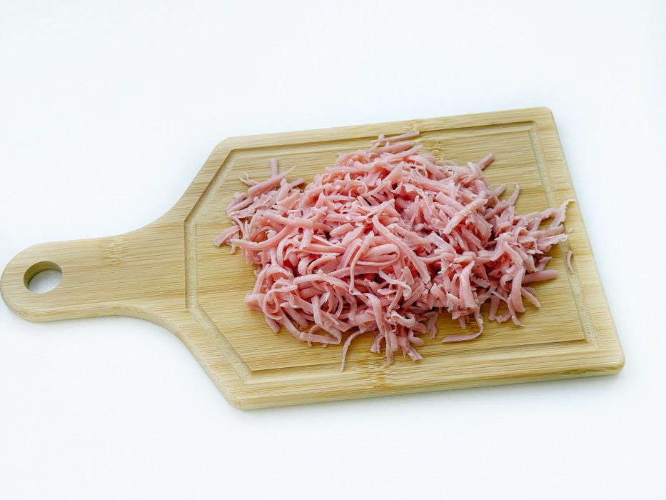 Измельчите ветчину на крупной тёрке.