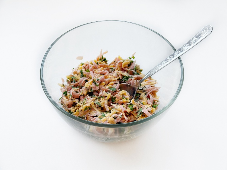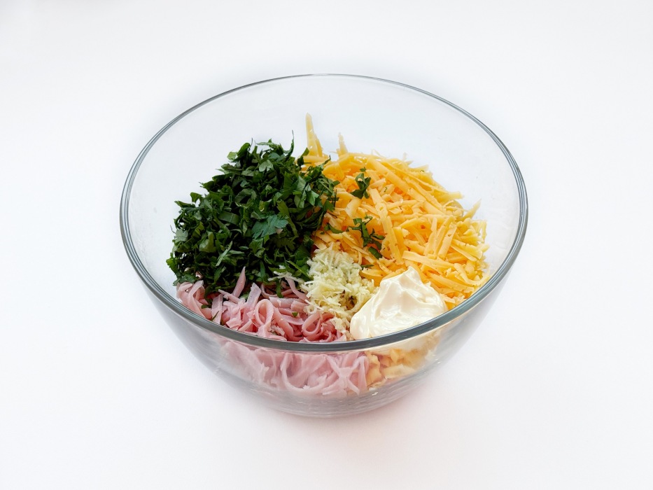 В миске смешайте ветчину, сыр, чеснок, зелень и майонез.