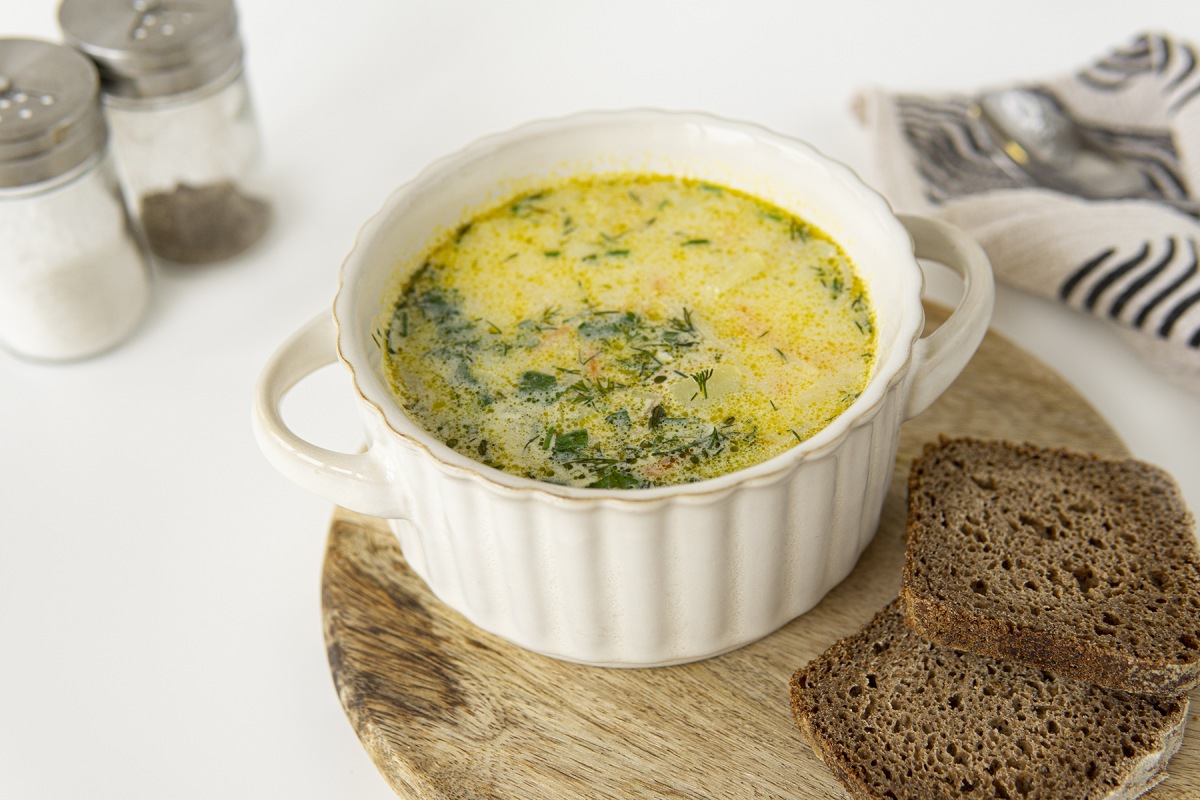 Сливочный куриный суп готов к подаче. Отлично дополнит блюдо ломтик бородинского хлеба.