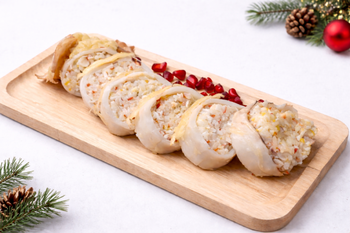 За 2 дня: соедините начинку, очистите кальмары, бланшируйте их в кипятке и заполните фаршем. Уберите в холодильник под пищевой плёнкой.