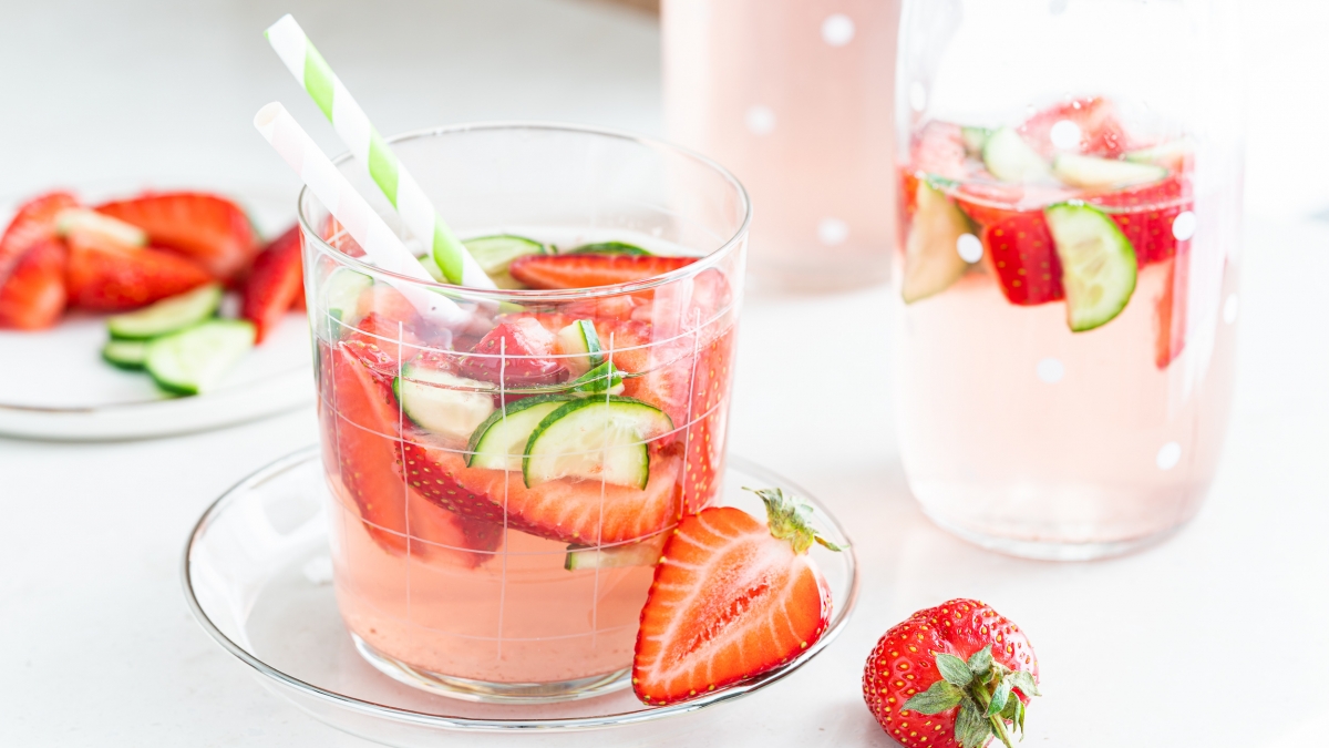 Подготовьте все компоненты для домашнего лимонада с клубникой и огурцом заранее. Выбирайте яркие, спелые ягоды — они обеспечат напитку мягкий розовый оттенок и насыщенный вкус. Используйте только свежую клубнику, замороженная не подойдет. Огурцы должны быть упругими, без признаков вялости.