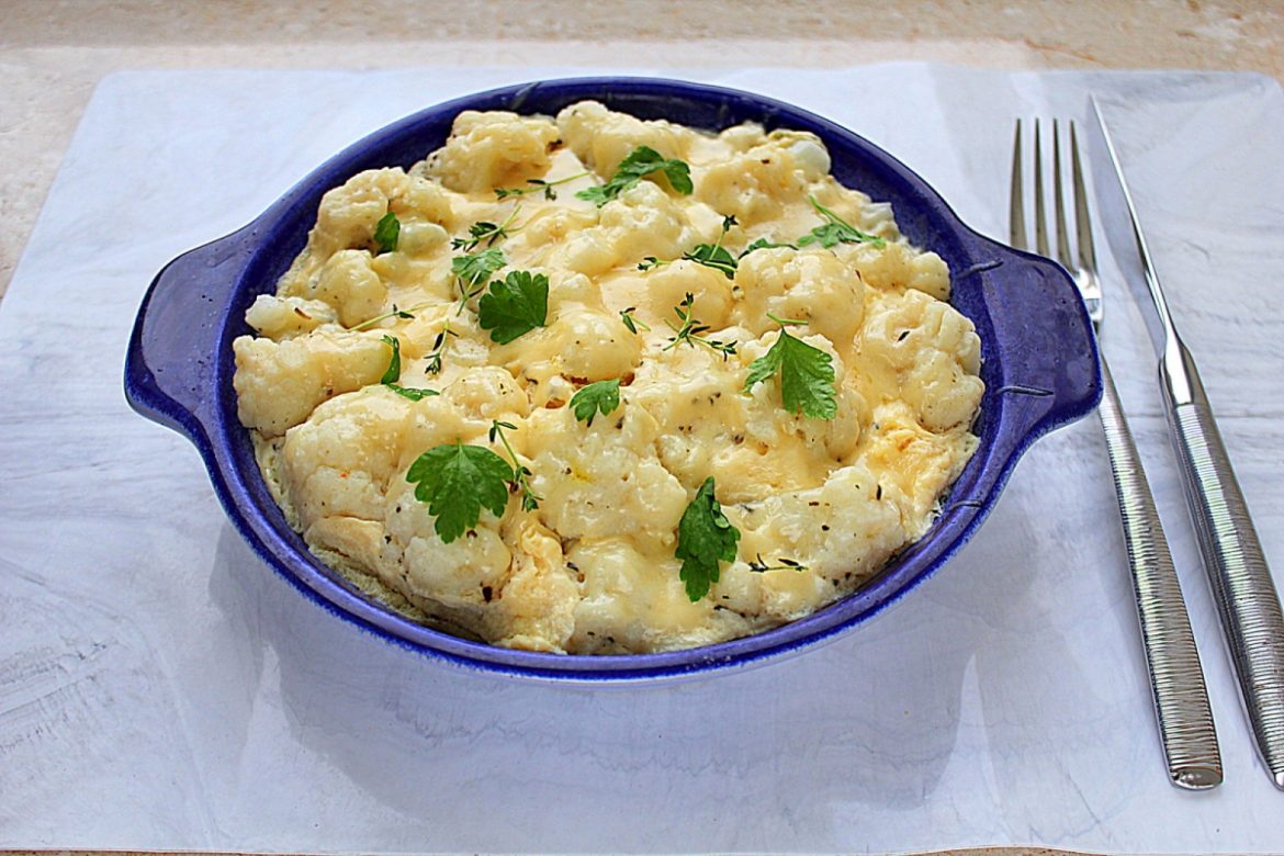 Распределите соцветия по форме для запекания и залейте яичной смесью. Я применяю керамическую емкость, подходящую и для духовки.