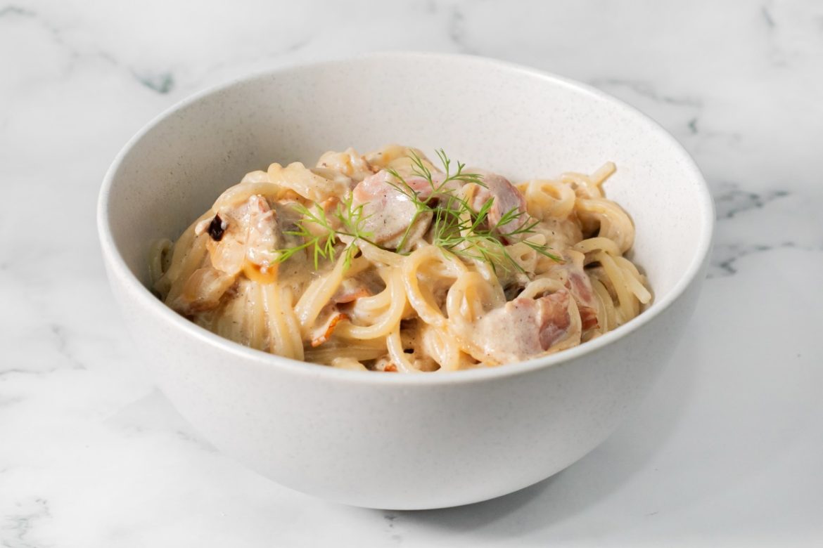 Соберите все компоненты для блюда. Выбирайте бекон с минимальной жировой прослойкой, так как сливочный соус сам по себе достаточно насыщенный. Сливки берите от 20% жирности — иначе соус не получится нужной консистенции.