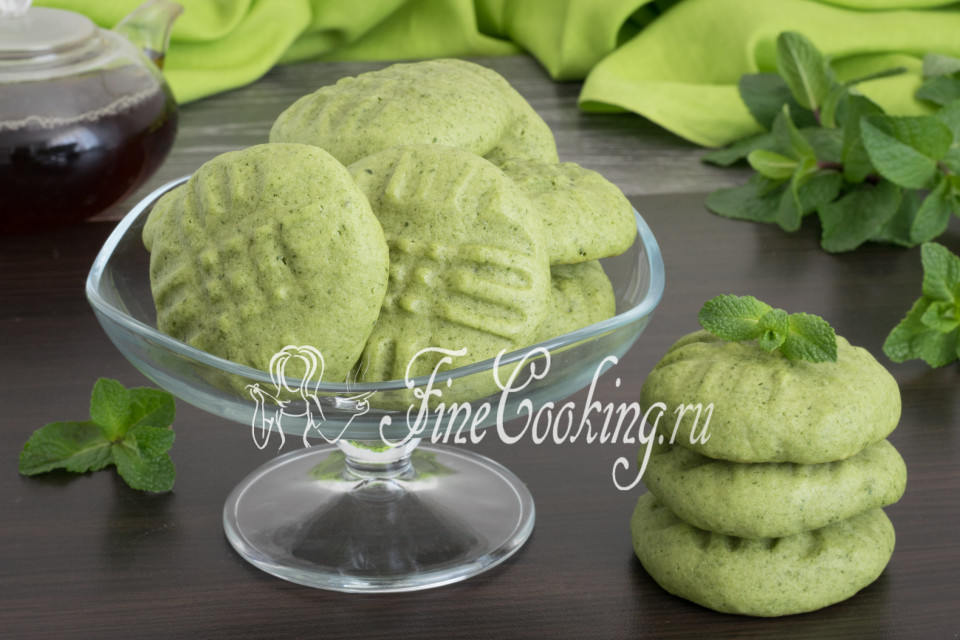 Автором рецепта является Ирина Хлебникова, за что ей отдельная благодарность. Стоит отметить, что некоторые кулинары, опробовавшие этот вариант, остались недовольны оттенком готового печенья. Вероятно, цвет зависит от разновидности используемой мяты.