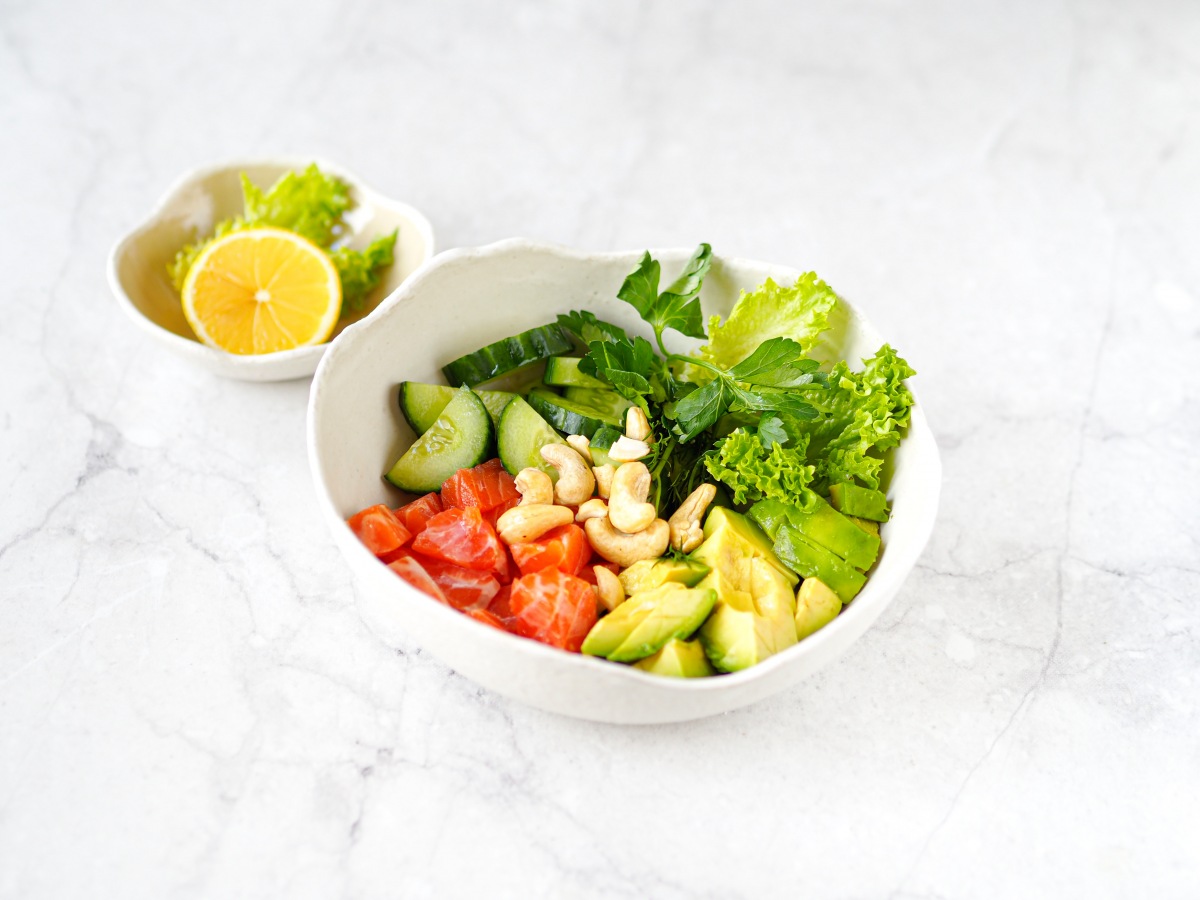В глубокую миску выложите ингредиенты: рыбу, авокадо, огурец и зелень. Не смешивайте компоненты, распределите их отдельными секциями.