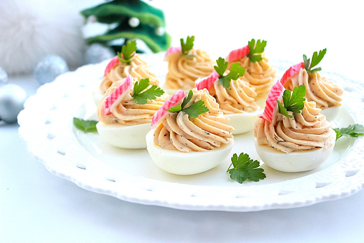 Фаршированные яйца с крабовыми палочками и плавленым сыром для новогоднего стола готовы!