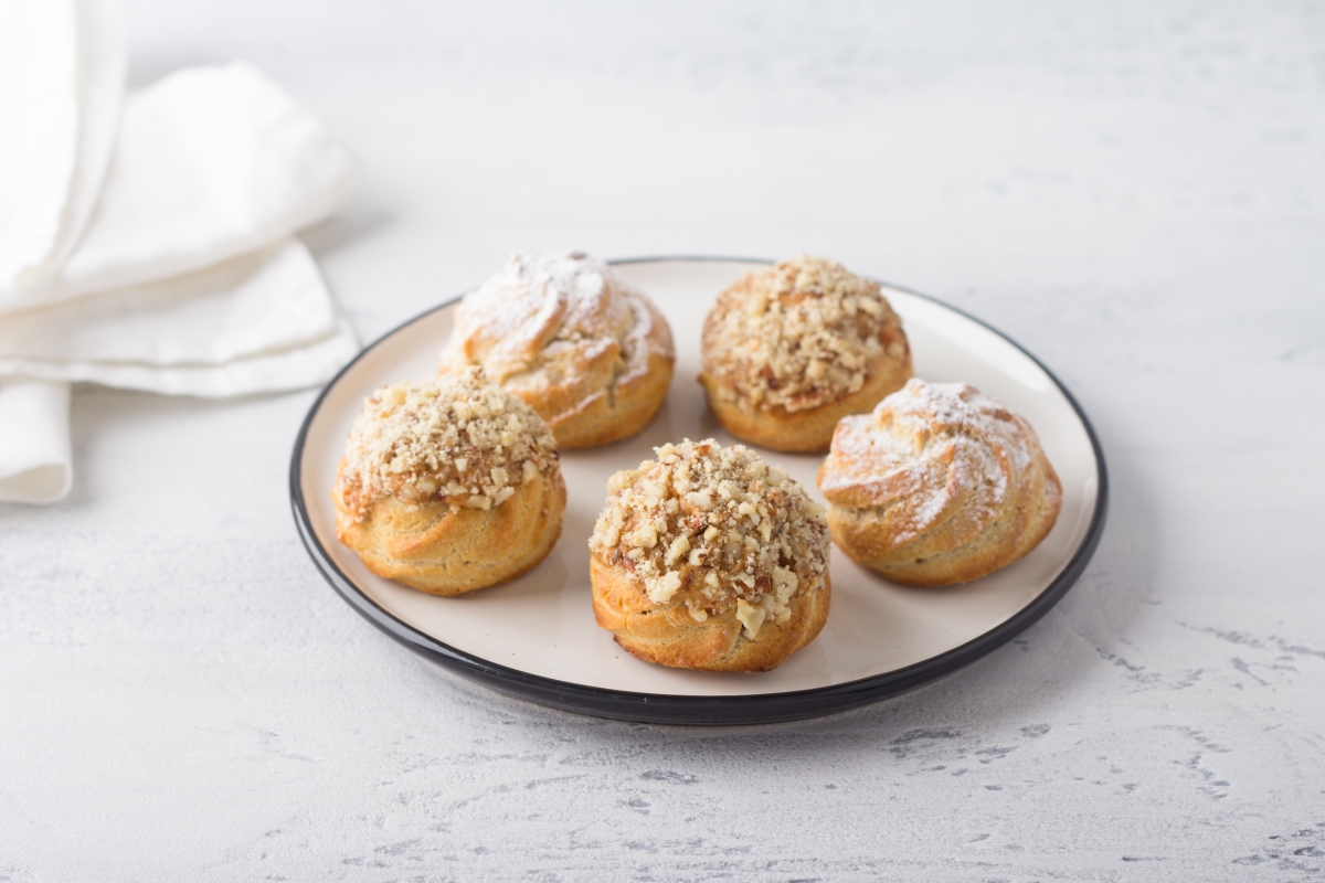 Воду разрешается полностью или частично заменять молоком. Масло сливочное (20 г) для начинки должно быть мягким. В тесте его можно заменить растительным. Для крема подойдёт любой мягкий сыр или творог (например, рикотта). Орехи используйте по вкусу.