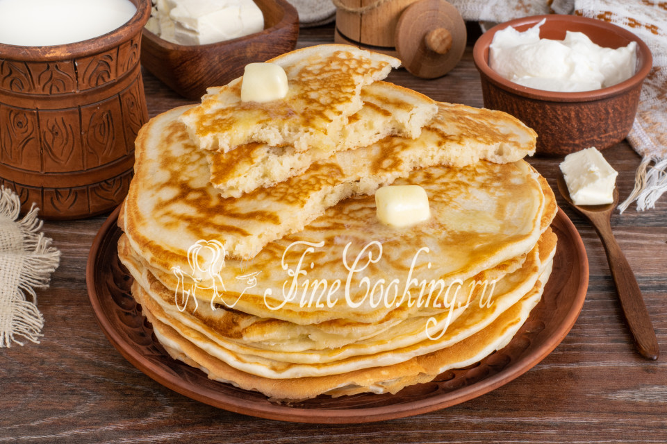 Получится 6 румяных блинов диаметром 19-20 см. Смажьте их теплыми сливочным маслом для аромата. Приятного аппетита!