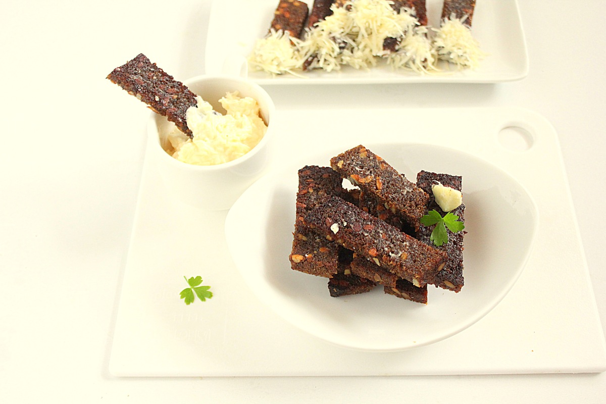 Объём чеснока регулируйте по своему вкусу. Свежеперетёртый чеснок придаёт неповторимый аромат. Используемый мной хлеб имеет плотную структуру с зёрнами и семенами. Вес 4 кусков — 200 г. Это оптимальное количество для большой сковороды (диаметр 28 см). Для более лёгких сортов хлеба вес порции может отличаться.