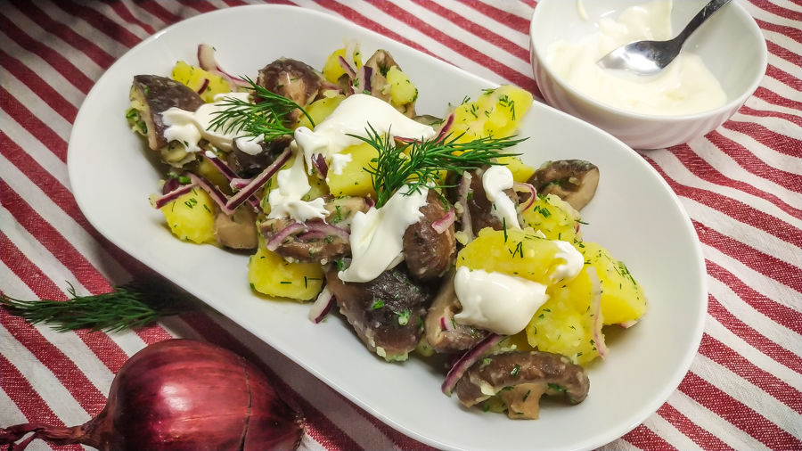 Картофель, грибы и огурцы нарезаем пластинами. Лук шинкуем полукольцами, укроп тщательно измельчаем.