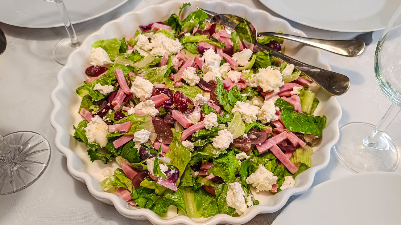 Листья салата, ветчину, виноград и треть сыра соединяем в миске, поливаем соусом и аккуратно перемешиваем.