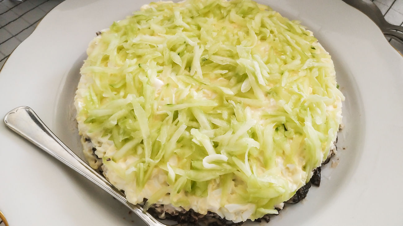 Посыпаем тёртыми огурцами, накрываем пищевой плёнкой и убираем в холод минимум на 30 минут.