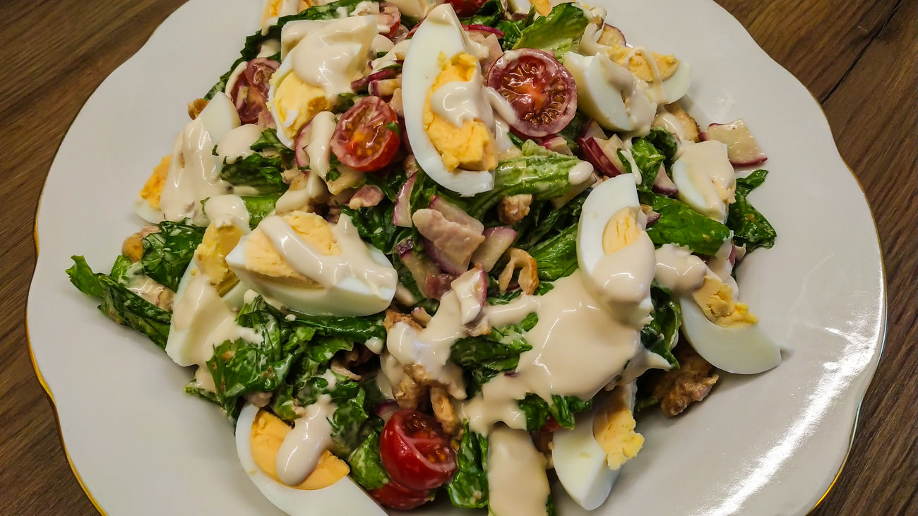 Листья салата рвём руками в глубокую чашу. Добавляем все подготовленные компоненты, кроме яиц. Смешиваем с заправкой, оставив немного соуса для завершающего этапа.