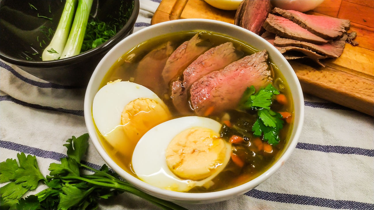 При подаче украшаем блюдо половинками варёных яиц, кусочками мяса и свежей петрушкой.