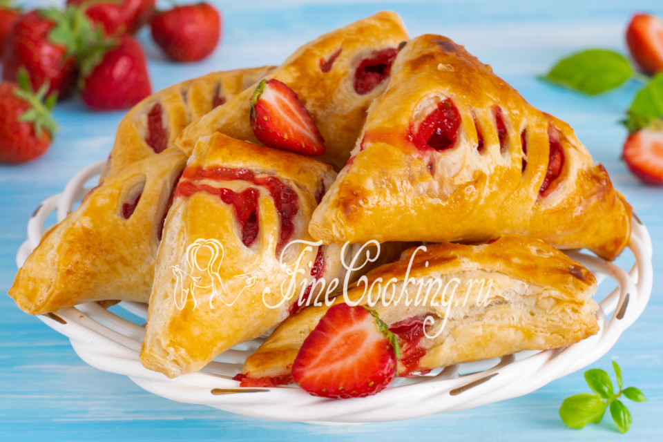 Необходимые продукты: бездрожжевое слоеное тесто, 200 г подготовленной клубники, сахарный песок, ванильный сахар, кукурузный крахмал (1 ч. л.) и одно мелкое яйцо для обработки поверхности.
