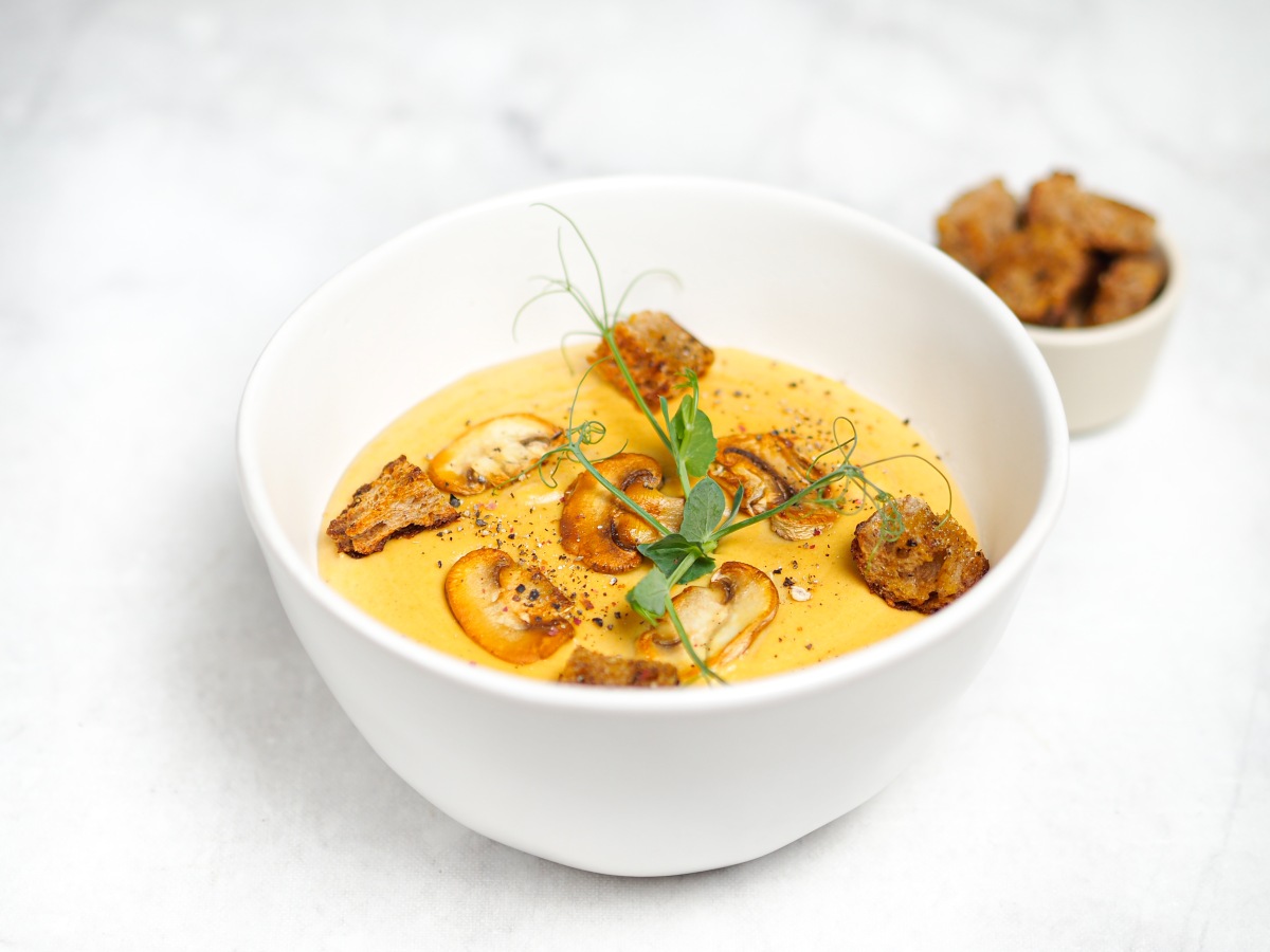 Разлить суп по порционным тарелкам. Посыпать свежемолотым перцем. Украсить обжаренными грибами. По желанию добавить зелень: микрогрин, петрушку, укроп или зелёный лук. Подавать с гренками или хрустящими тостами. Приятного аппетита!